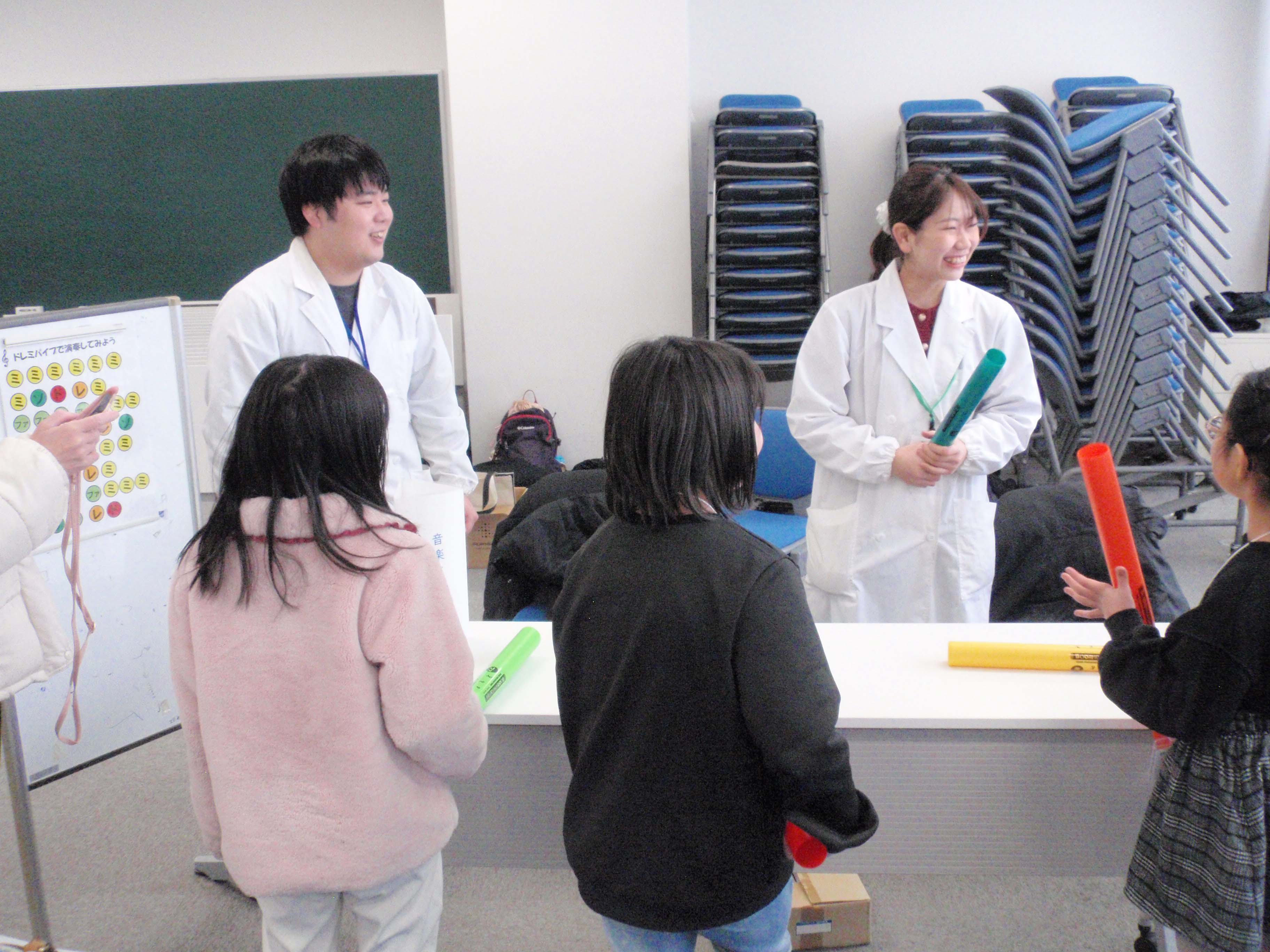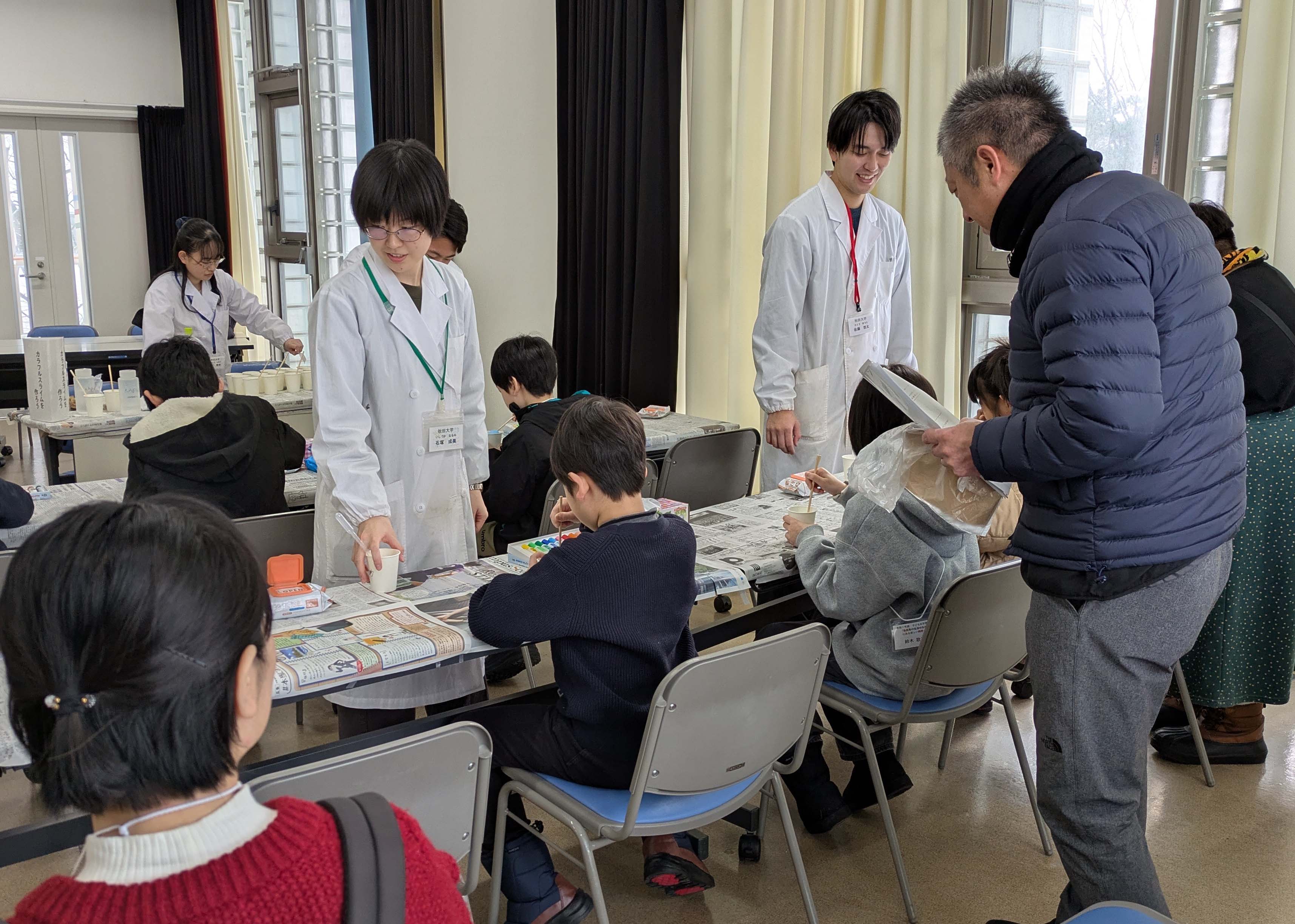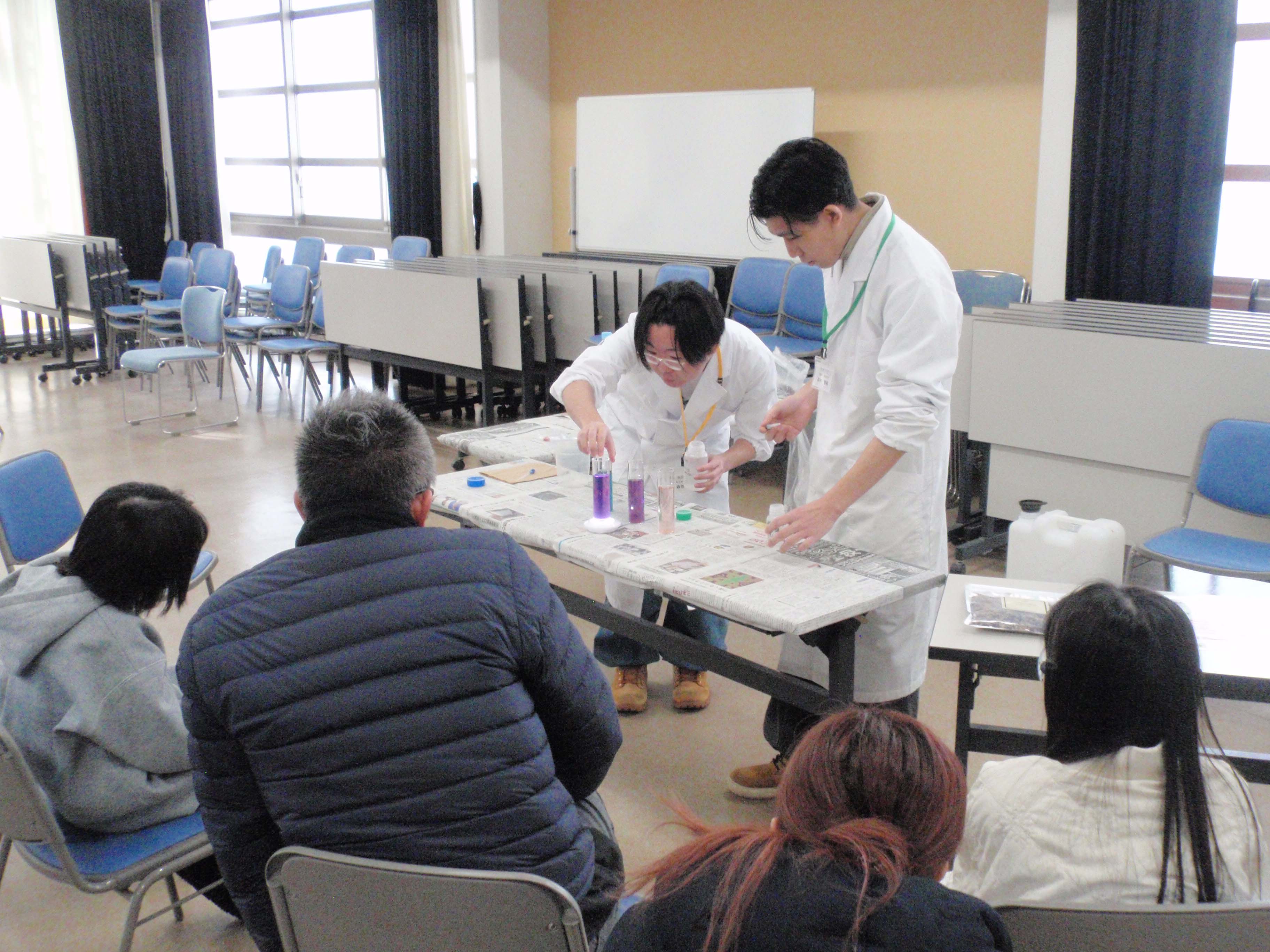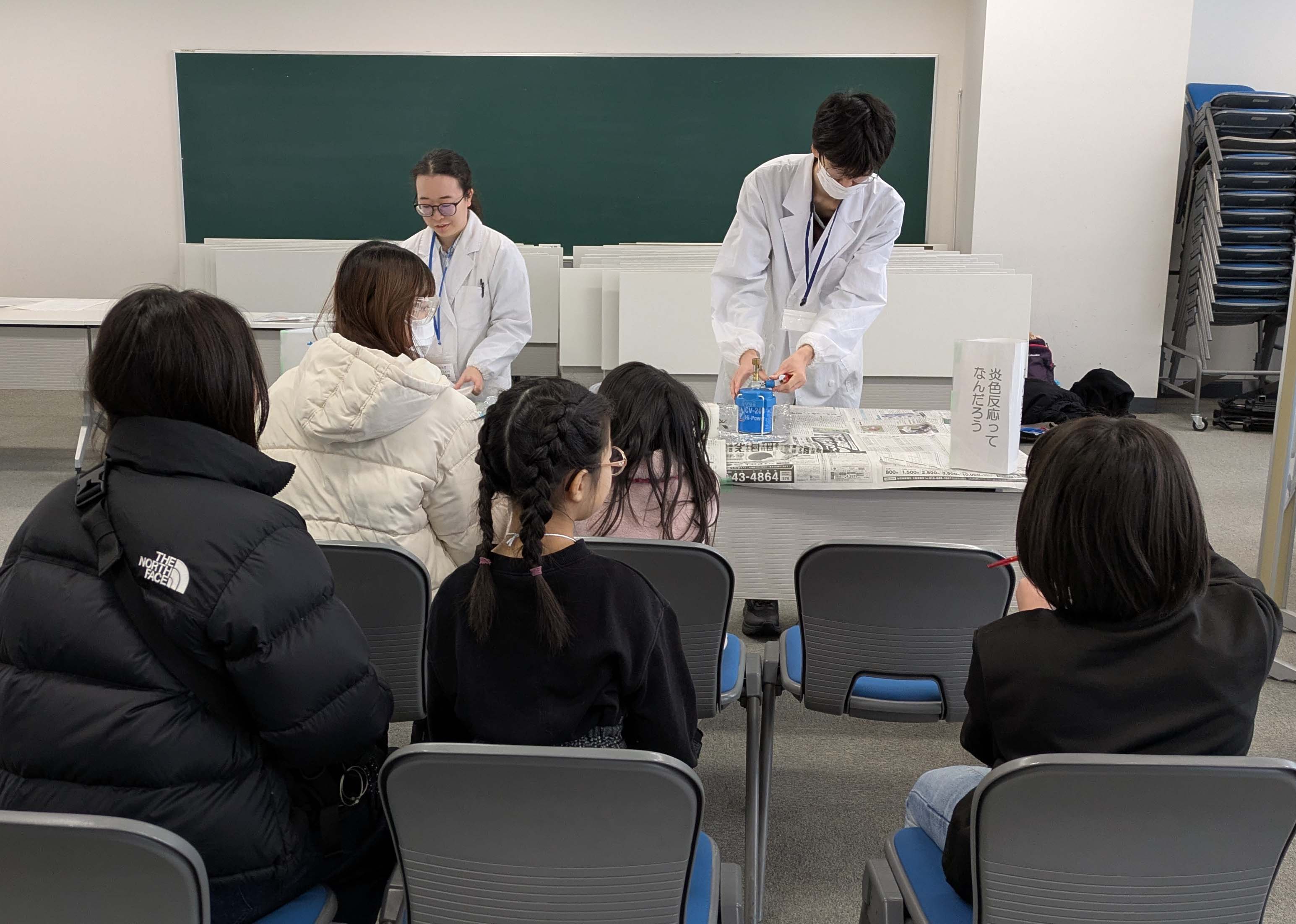 開会式の後、参加者は『インクの色を分けてみよう』『マローブルーでpHをはかろう』『カラフルスライムを作ろう』『炎色反応ってなんだろう』『木炭で電池を作ろう』『音楽と科学』といった6つのテーマから各々自由に選択し、順番に実験を体験。参加者からは「いろいろなことを知れた」「全部楽しかったし、勉強になった」「また来たい」「やさしく説明してくれて分かりやすかった」などの声をいただきました。
