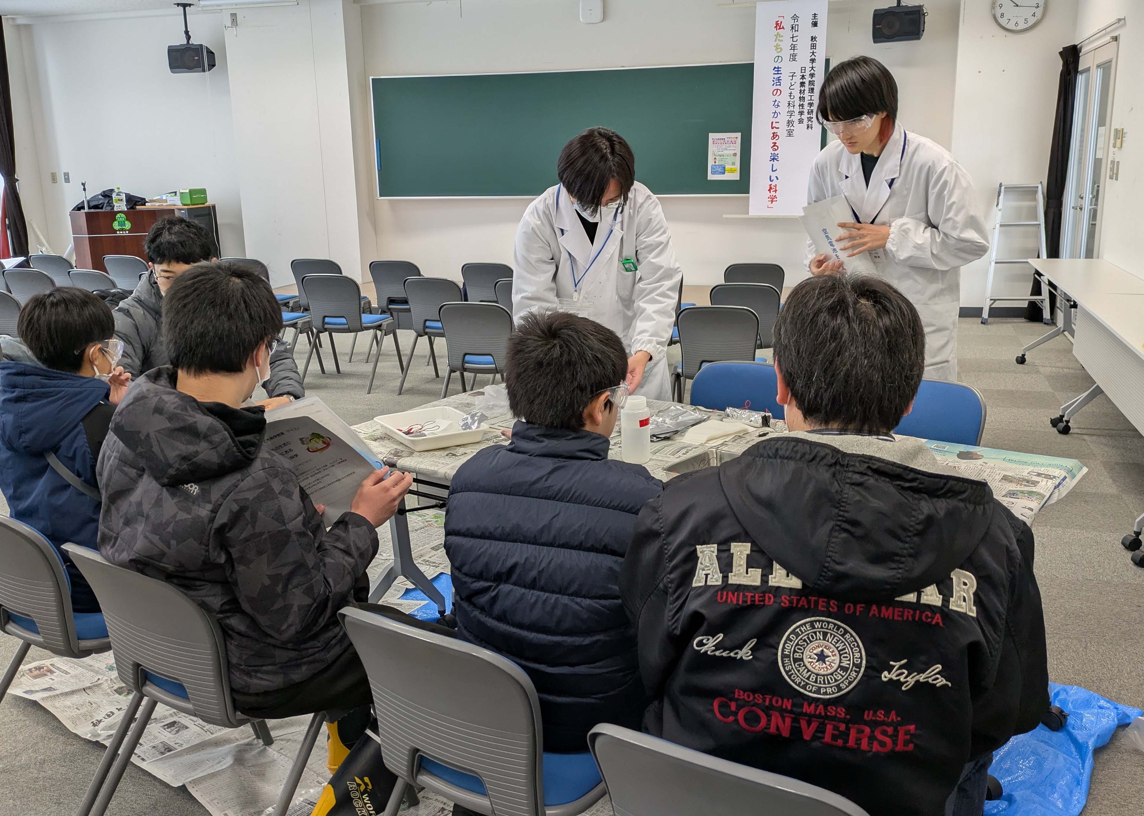 令和7年12月27日(土)に、本研究科 応用化学コース 無機材料化学研究室 が指導を務める令和7年度 子ども科学教室『私たちの生活のなかにある楽しい科学』が、本学手形キャンパスを会場として開催されました。本教室は、 日本素材物性学会 と本研究科が主催となり、例年冬休みが始まる時期に企画されているもので、保護者やご家族の方も含め約40名の参加がありました。