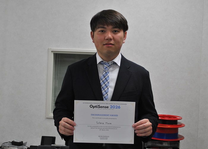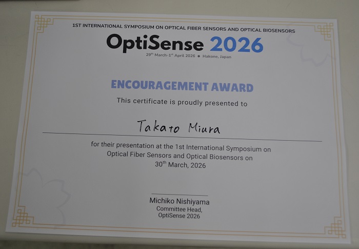 本研究科 博士前期課程 1年次 三浦 卓士 さん(受賞時:数理・電気電子情報学部 電気電子工学コース 4年次)が、国際シンポジウム 『1st International Symposium on Optical Fiber Sensors and Optical Biosensors』 (OptiSense 2026)において、奨励賞を受賞しました。