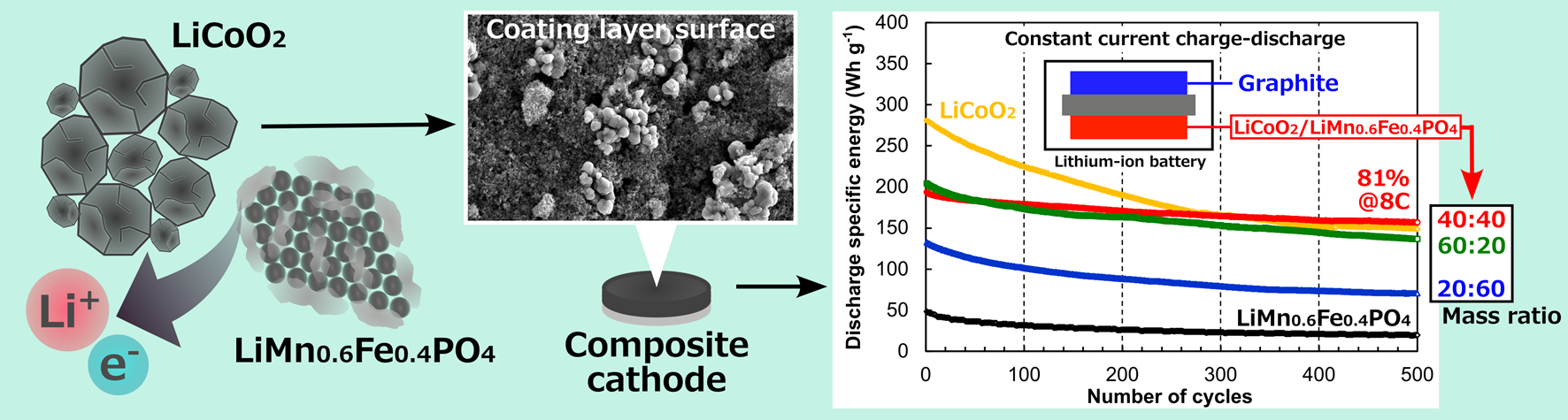 本研究科 数理・電気電子情報学専攻 電気電子工学コース 安部 勇輔 助教らの研究グループは、コバルト酸リチウムとリン酸マンガン鉄リチウムから成るリチウムイオン電池用複合正極を製造し、それが高電流密度下でのリチウムイオン電池のサイクル特性改善に効果的であることを発表しました。車載用電池や電力貯蔵用大型電池での活用が、この新たな複合正極に期待されます。
