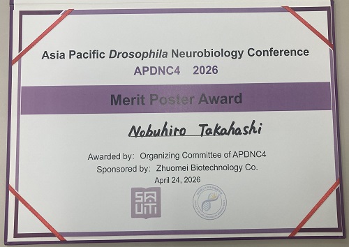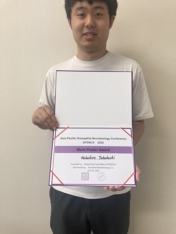 本研究科 博士後期課程 3年次 高橋伸碩さん(総合理工学専攻 生命科学領域)が、国際会議『4th Asia-Pacific Drosophila Neurobiology Conference/ APDNC4)』 において、優秀ポスター賞 (Merit Poster Award) を受賞しました。